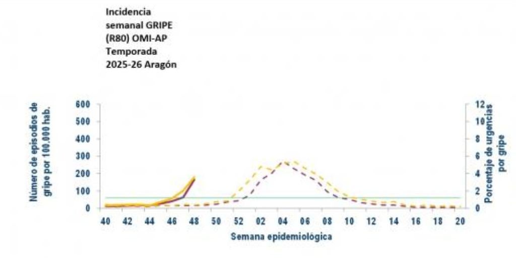 El umbral está fijado en Aragón en 59,6 casos por 100.000. Este nivel 2 se declara en aplicación del protocolo de escenarios de riesgo y recomendaciones frente a la gripe del Gobierno de Aragón, uniéndose así la provincia de Huesca a la de Zaragoza, que se encuentra en ese nivel desde la semana pasada.