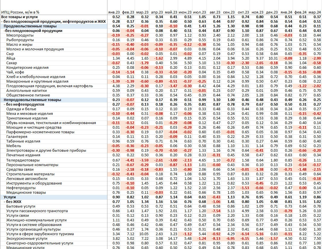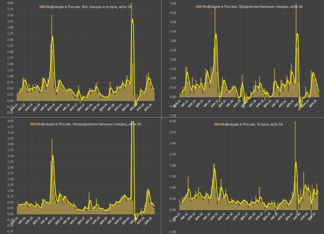 Структурно инфляция неоднородна. В конце 2023 основной импульс роста цен генерировался в товарах, а сейчас в услугах.