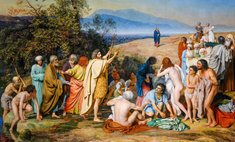 9. Профессор Иван Астафьев (в эссе 1916 года) так комментирует следующую сцену: «Две другие фигуры, они, как видно, едва вышли из воды и готовились одеваться, но в эту самую минуту проповедь Иоанна коснулась их слуха, и они, боясь проронить хоть одно слово, остановились. Дрожание слез в глазах, полных умиления, выражается в трепетном дрожании всего тела. Что этот человек тронут до глубины души, что в словах Пророка видит он спасительные надежды, что он добр и мягок сердцем, это узнаем мы тотчас. Юноша же, не понимая глубокого смысла проповеди, слушает внимательно под влиянием какого-то страха, смешанного с любопытством, свойственном его возрасту».