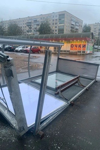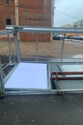 А на углу улиц Рихарда Зорге и Десантников упала остановка. Крепления конструкции не справились с порывами ветра.