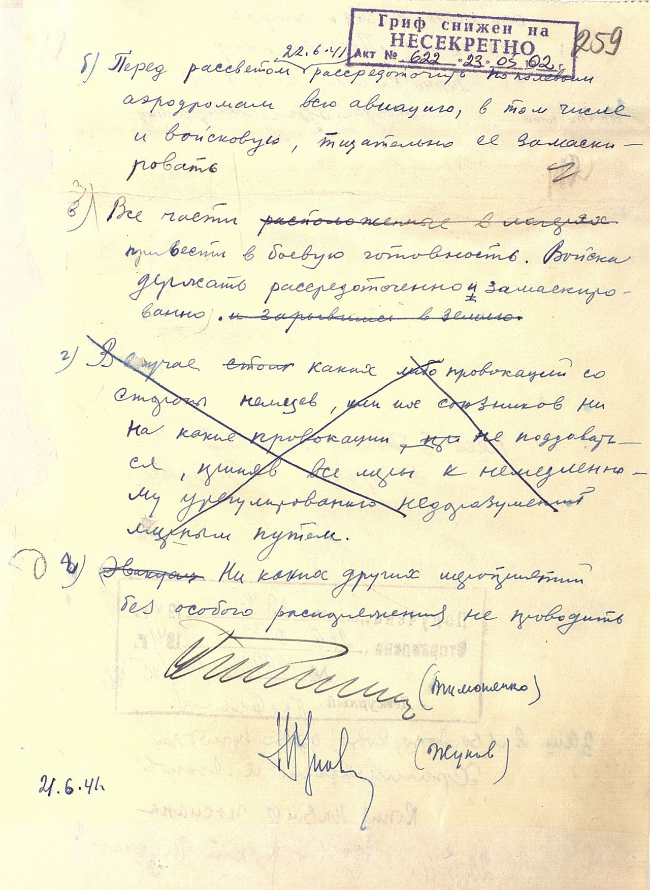 «б) Перед рассветом 22.6.41 рассредоточить по полевым аэродромам всю авиацию, в том числе и войсковую, тщательно ее замаскировать