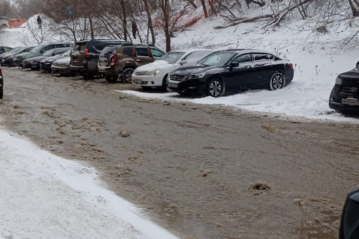 21 декабря на улице Лескова в Новосибирске случился потоп — вода растеклась по дороге вдоль парковочных мест.