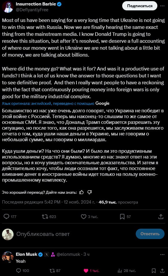 Новый закадычный друг Трампа миллиардер Илон Маск поддержал запись в своей соцсети, в пух и прах разносящую проект «Украина»: