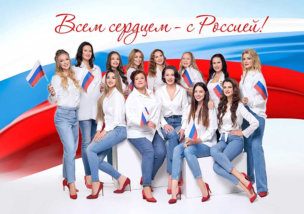 На фото все женщины – в белых рубашках, светло-синих джинсах и красных туфлях, то есть одеты в цвета российского флага.