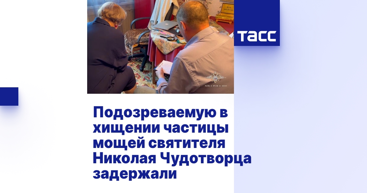 МОСКВА, 31 августа. /ТАСС/. Полицейские задержали подозреваемую в хищении частицы мощей святителя Николая Чудотворца из храма в Кировске Ленинградской области. Об этом ТАСС сообщила официальный представитель МВД России Ирина Волк.