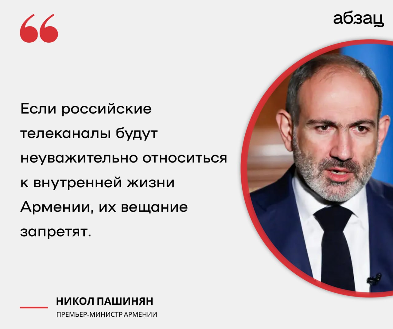 Пашинян пригрозил отключить российские телеканалы По словам премьер-министра страны, это произойдёт в том случае, если «многочисленные требования армянских властей» будут проигнорированы. На пресс-конференции Никол Пашинян также заявил о существенном снижении рисков безопасности Армении: «За последние пять-шесть месяцев мы предприняли ряд важных действий, и самым важным результатом реализации на данном этапе мирной повестки является существенное снижение рисков безопасности и начало формирования гарантий безопасности». Подписывайтесь на «Абзац»