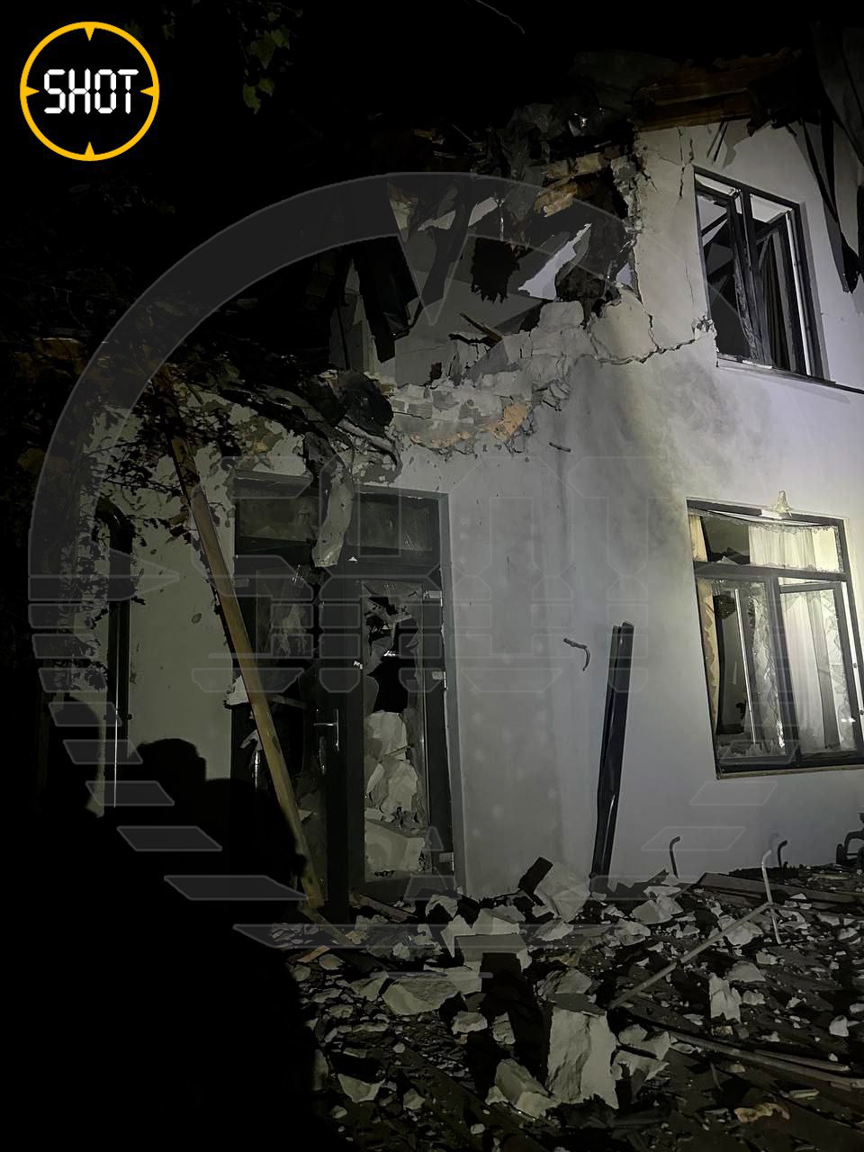 В доме обрушилась часть стены на втором этаже. Сейчас территория оцеплена, на месте работают экстренные службы. Также обломками задело соседний коттедж.