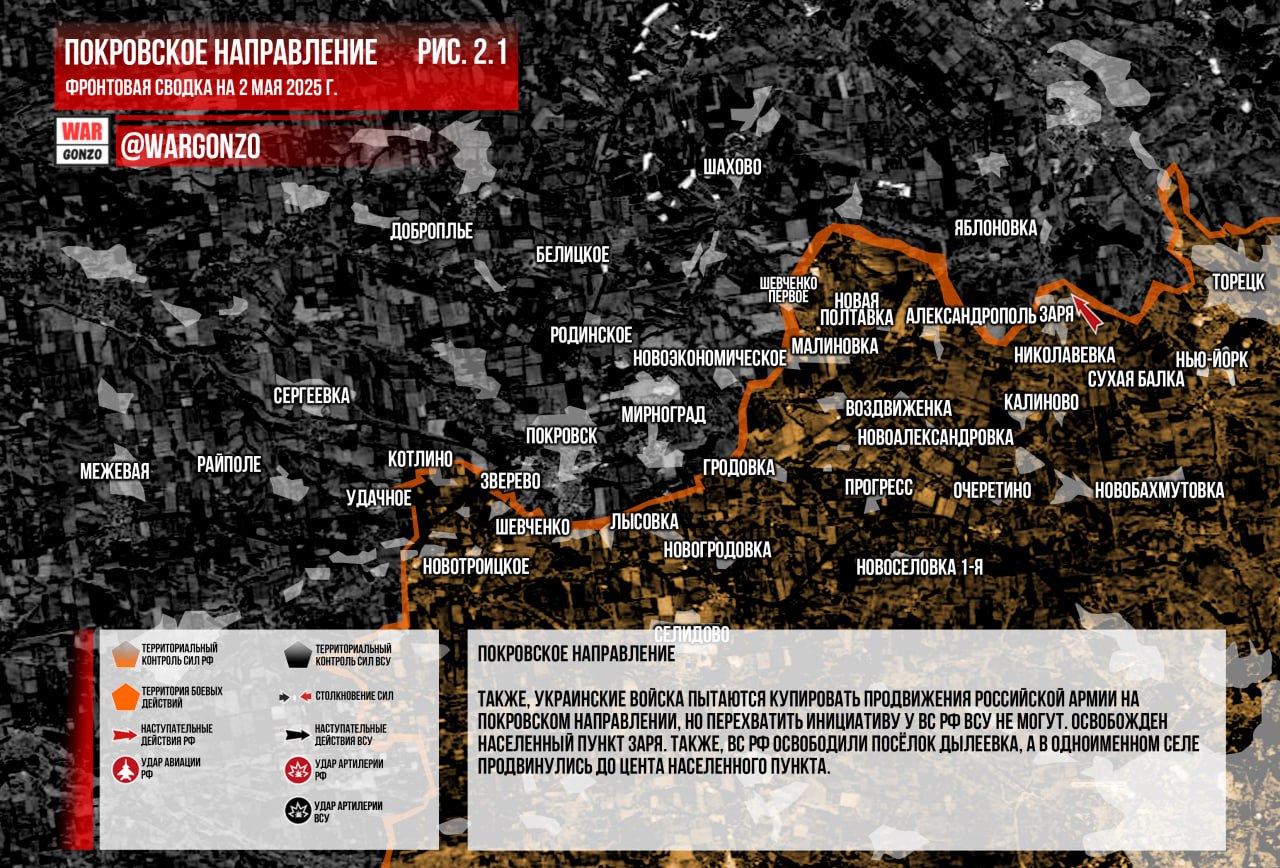 Донецкий фронт. На Южно-Донецком направлении отражены очередные попытки ВСУ контратаковать. Успеха украинские накаты не принесли, а вот ВС РФ продолжают вести работу по улучшению своих позиции и подготовке дальнейшего наступления на Комар. Также, украинские войска пытаются купировать продвижения российской армии на Покровском направлении, но перехватить инициативу у ВС РФ ВСУ не могут. Освобожден населенный пункт Заря. Также, ВС РФ освободили посёлок Дылеевка, а в одноименном селе продвинулись до цента населенного пункта. (Рис. 2)