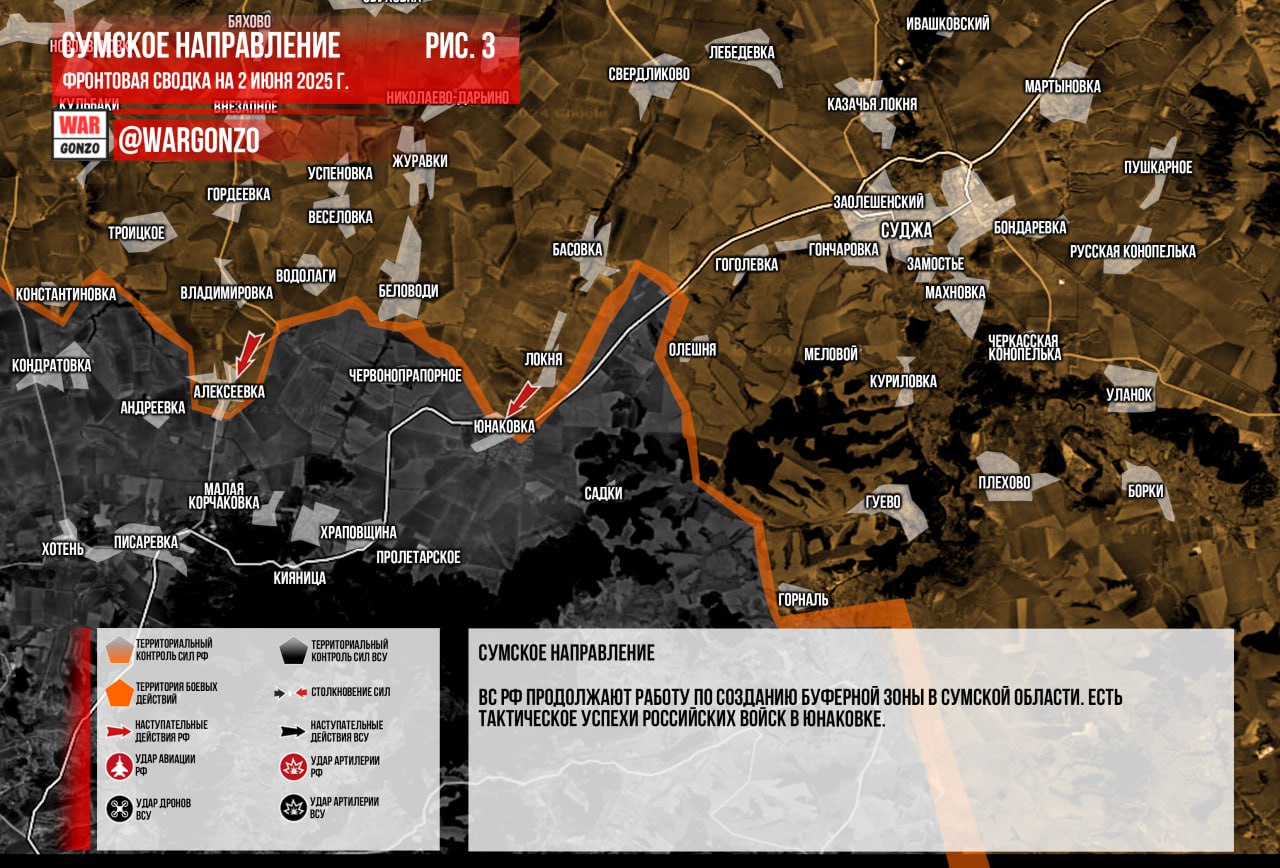 Сумское направление. ВС РФ продолжают работу по созданию буферной зоны в Сумской области. Есть тактическое успехи российских войск в Юнаковке. ВСУ продолжают попытки атаковать наши позиции в районе Тёткино, но каждый раз накаты заканчиваются уничтожением личного состава и техники противника. (Рис. 4)
