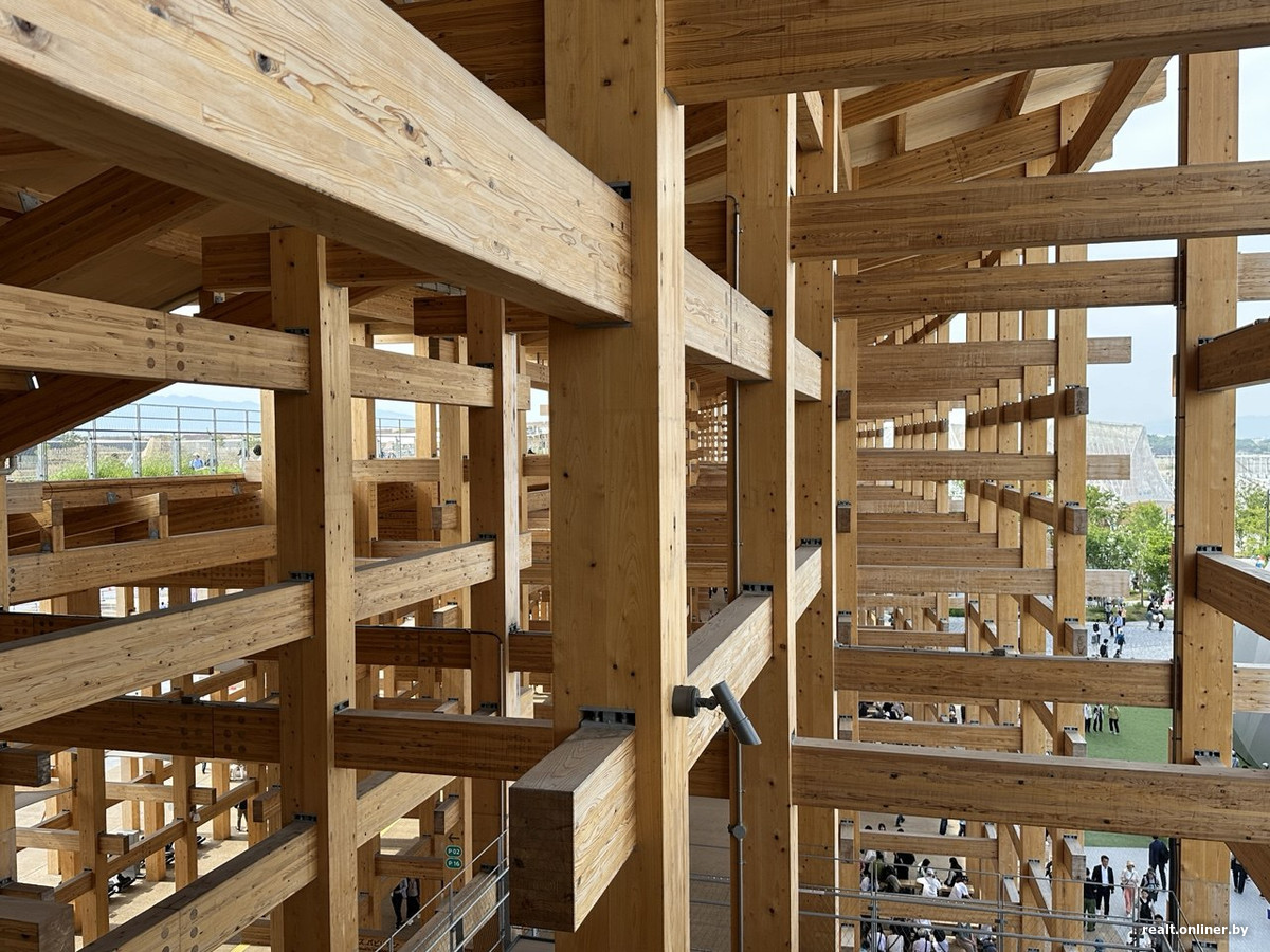 Японцы отдельно подчеркивают, что все кольцо создано из местных кедров и кипарисов с небольшой примесью шотландской сосны. Экологи от таких слов могут прийти в состояние аффекта из-за массовой вырубки деревьев для строительства пусть и крупнейшей в мире, но временной деревянной структуры. Однако с точки зрения устойчивого развития, которому в том числе посвящена выставка, дерево — самый экологичный из-за своей возобновляемости материал. Япония прекрасно озеленена, и можно быть уверенным, что компенсационные посадки были сделаны еще до фактической вырубки растений для сооружения.