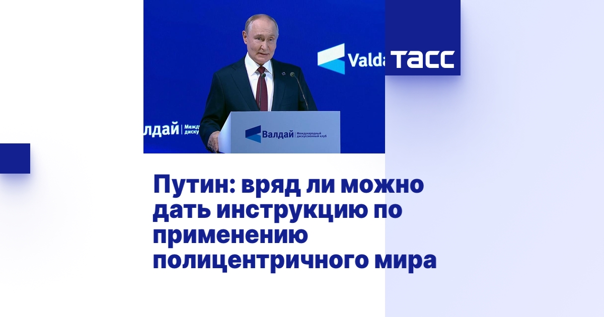 СОЧИ, 2 октября. /ТАСС/. Президент РФ Владимир Путин заявил, что вряд ли возможно дать инструкцию по применению полицентричного мира, тем более что все инструкции даются лишь для того, чтобы их нарушать. С такого посыла он начал свое выступление на пленарной сессии дискуссионного клуба "Валдай".