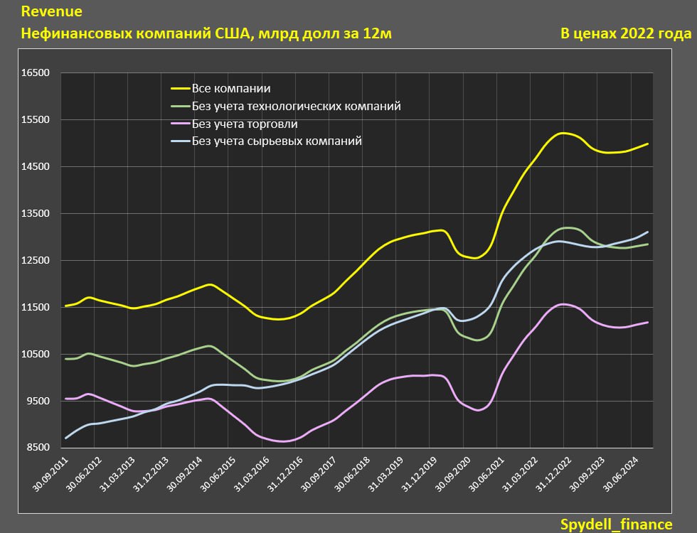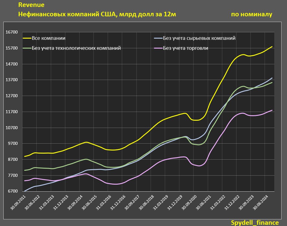 Выручка нефинансовых компаний США выросла на 4.7% г/г и всего 5.4% за два года, за 9м24 рост на 4.1%, за два года +4.5%, за 5 лет +38.3% (9м24 к 9м19).