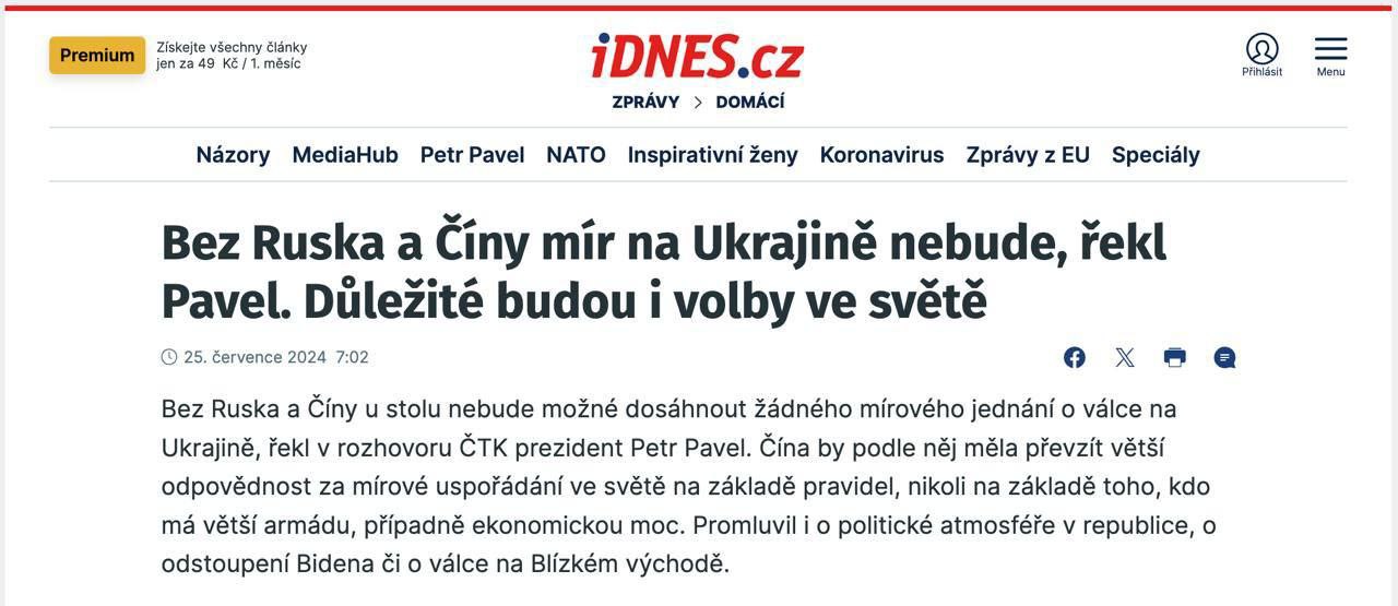 ⚡️Президент Чехии призвал привлечь РФ и Китай к мирным переговорам по Украине, — ČTK