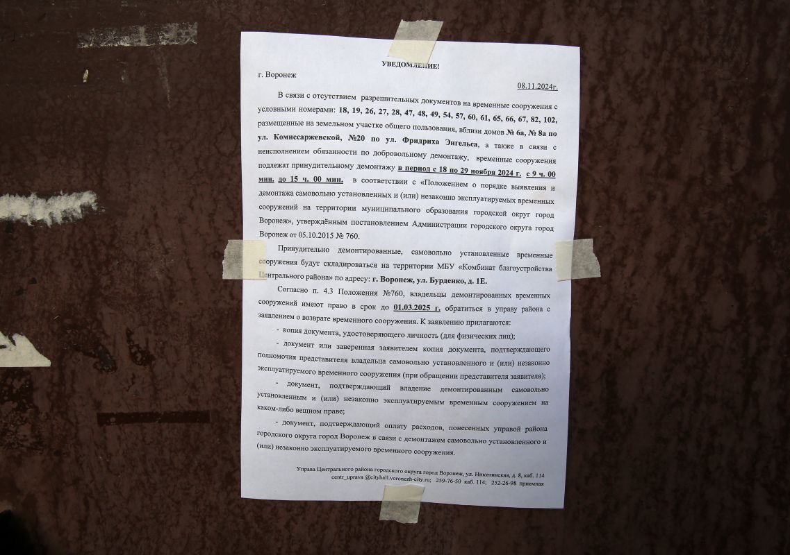 Гаражи и сараи в центре Воронежа, на которые нет разрешительных документов, будут сносить с 18 по 29 ноября. Речь идёт о постройках во дворах домов № 6а и 8а на улице Комиссаржевской и около дома № 20 по улице Фридриха Энгельса. Все они вместе с содержимом будут храниться на территории комбината благоустройства Центрального района. О первом дне работ читайте в репортаже «МОЁ!».