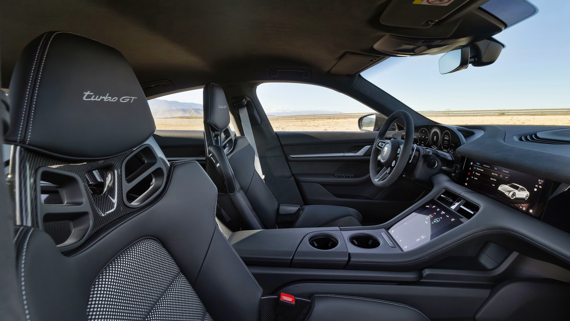 Taycan Turbo GT на 5 кг легче версии Turbo S: масса снижена за счёт углепластиковых элементов аэродинамического оперения кузова, углепластиковых каркасов передних сидений, отказа от электропривода крышки багажника, облегчённых колёс и облегчённых тормозных механизмов. Между тем вместо спартанских на вид углепластиковых ковшей без доплаты можно получить более комфортные передние кресла с кучей электрорегулировок, но масса электромобиля с ними, конечно, вырастет. До 100 км/ч стандартный Taycan Turbo GT разгоняется за 2,3 с, до 200 км/ч — за 6,6 с, максимальная скорость — 290 км/ч.