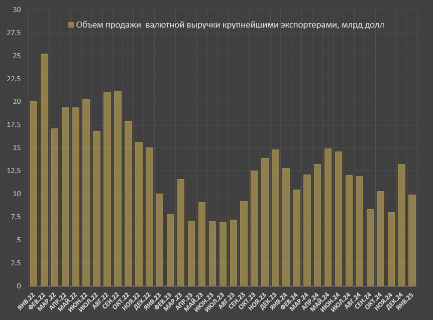Банк России два месяца не обновлял статистику по продаже валютной выручки, а последний отчет раскрыл подробности: 13.2 млрд в декабре и 9.9 млрд в январе. Много ли это или мало?