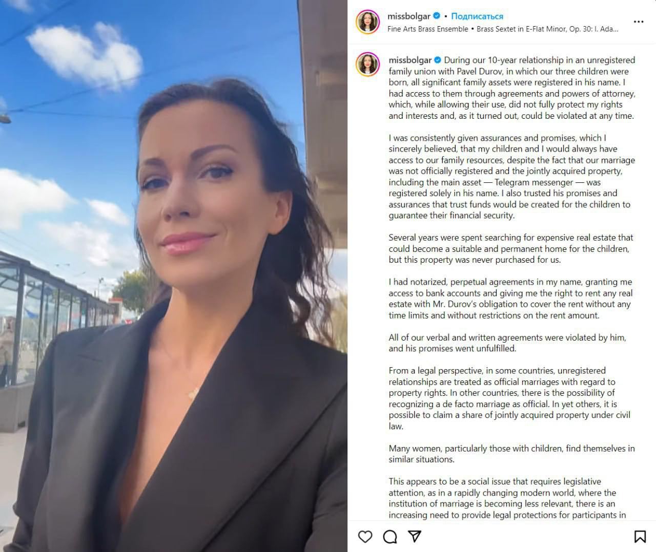«Наш брак официально не был зарегистрирован, а совместно нажитое имущество, включая основной актив — мессенджер Telegram, — было зарегистрировано исключительно на него», — написала женщина в соцсетях.