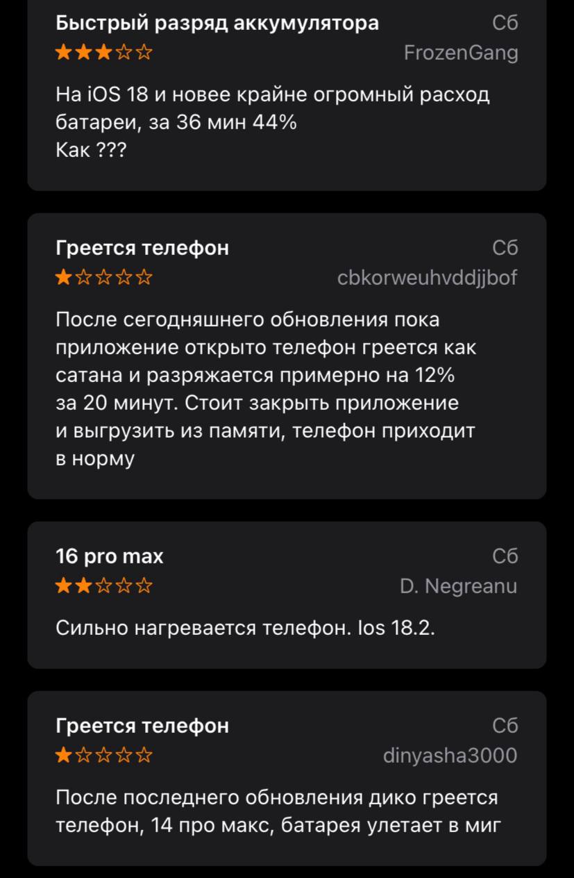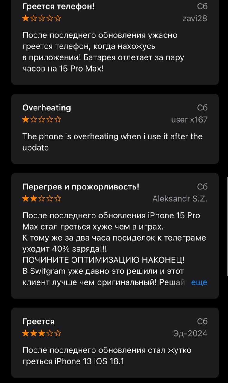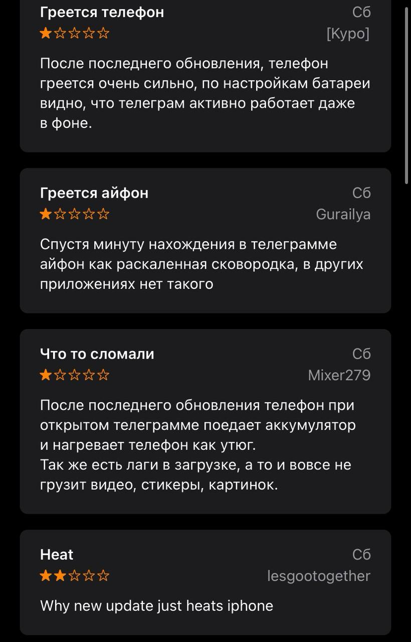 В AppStore у мессенджера появилось множество негативных отзывов: люди жалуются на сильный перегрев смартфона и быстрый расход заряда батареи. Чаще всего наблюдается при просмотре видео- и аудио контента.
