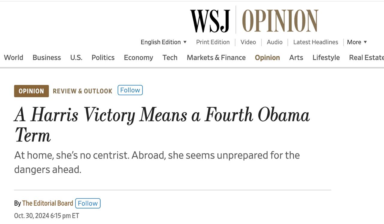 По мнению редакции WSJ, худшим сценарием была бы победа Харрис с победой демократов в Конгрессе, так как это дало бы ей чрезмерные полномочия.