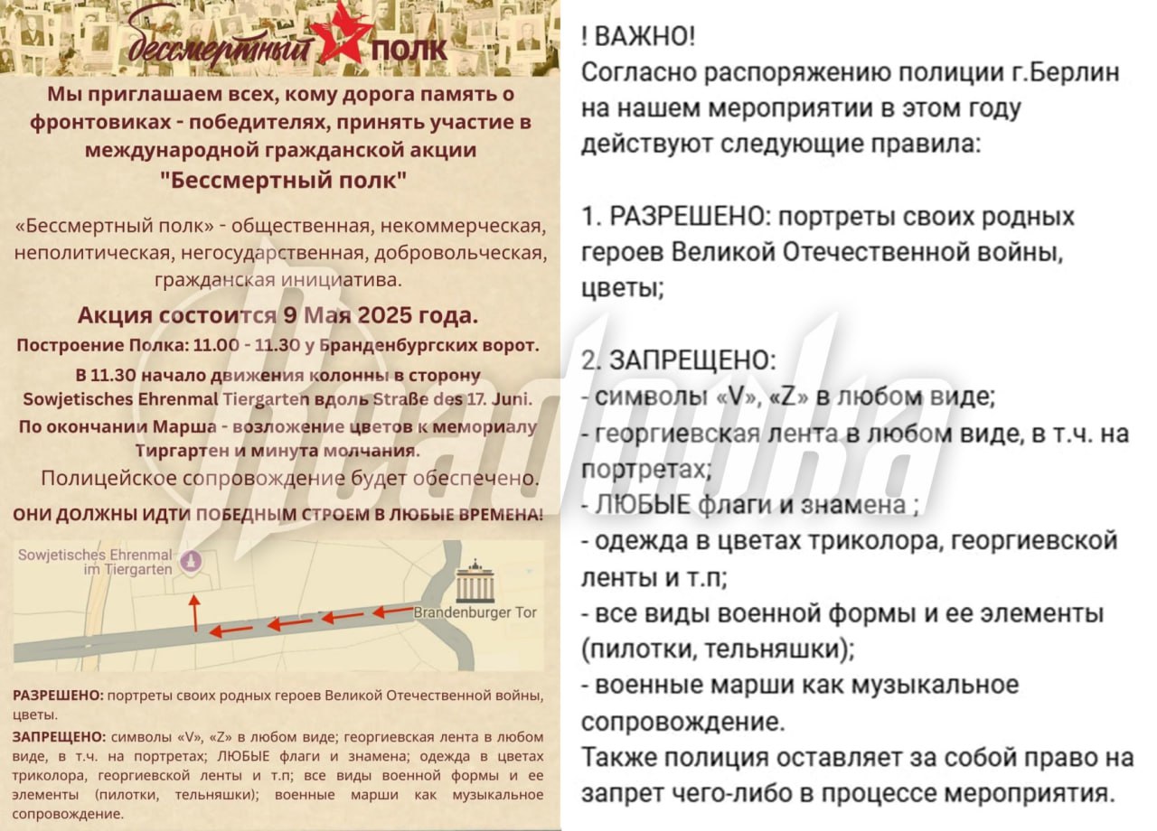Согласно заявлению организаторов, по распоряжению берлинских правоохранителей на акцию памяти героев Великой Отечественной запрещено приносить любые символы Победы — георгиевские ленты нельзя нанести даже на портреты. Были также запрещены любые предметы в цветах триколора, элементы военной формы и соответствующее музыкальное сопровождение. Причем, если все эти условия будут соблюдены, то не факт, что полиция не придумает запретить что-то еще в процессе мероприятия — об этом желающих в нем поучаствовать тоже предупредили.