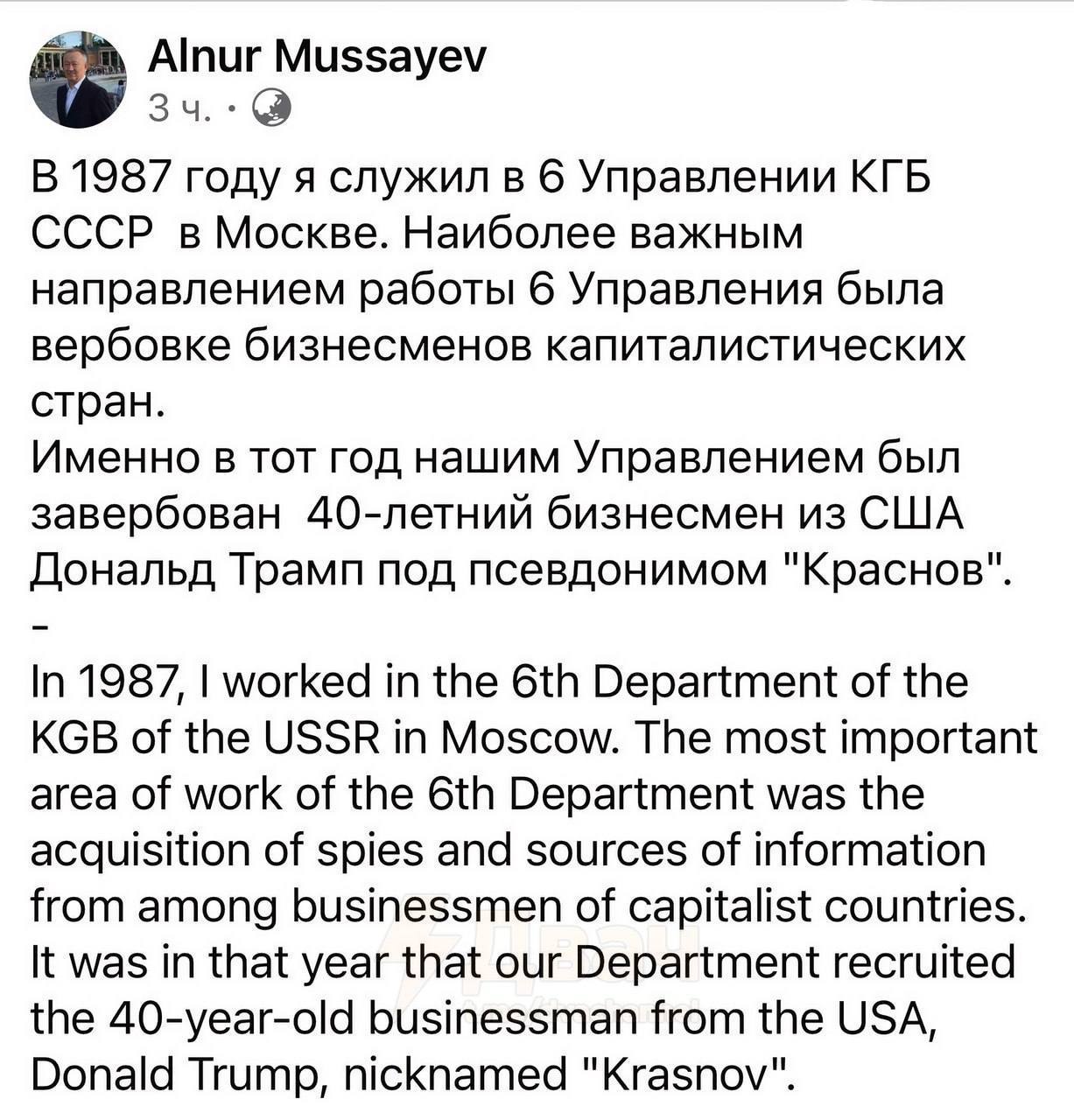 Бывший глава разведки Казахстана утверждает, что лично завербовал Трампа в 1987 году.