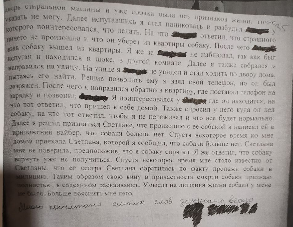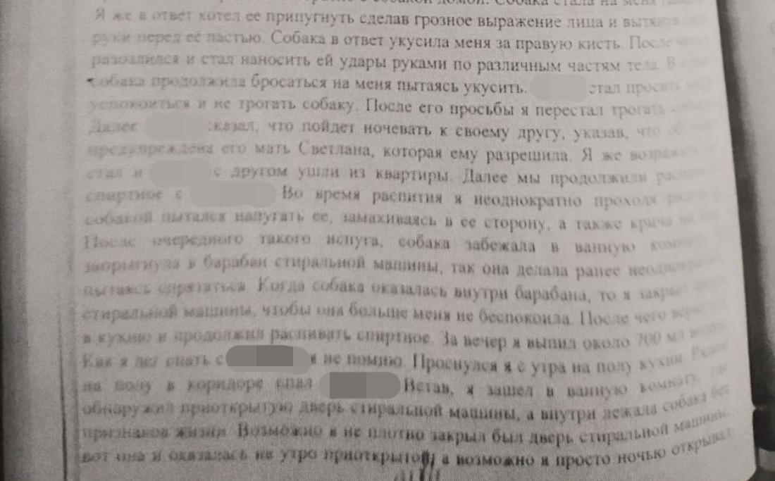 «Когда собака оказалась внутри барабана, я закрыл дверь стиральной машины, чтобы она больше меня не беспокоила. После чего вернулся в кухню и продолжил распивать спиртное. За вечер выпил около 700 мл водки. Как лег спать, не помню. Проснулся с утра на полу кухни. Встав, я зашел в ванную комнату, где обнаружил приоткрытую дверцу стиральной машины, а внутри лежала собака без признаков жизни», — говорится в документе.
