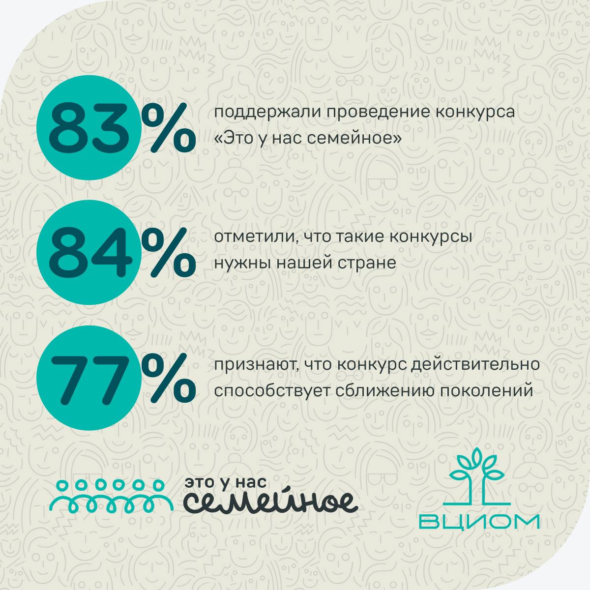 🔹 Начну с весомого: 83% россиян поддержали проведение конкурса «Это у нас семейное», а среди людей, которые знали о конкурсе, эта доля достигла 92%. При этом 84% отметили, что такие конкурсы нужны нашей стране.