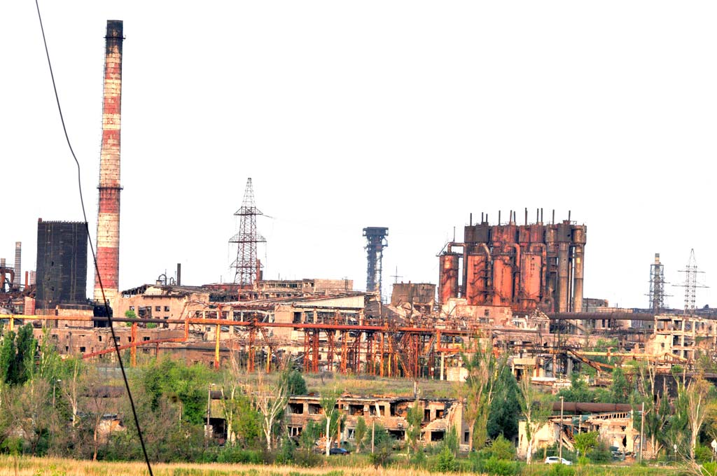 Вдали виден завод «Азовсталь». Говорят, его решили не восстанавливать, а сделать там рекреационную зону. Удивительно, но почему-то уцелели трубы бывшего завода-гиганта и возвышаются над мешаниной из камня и покореженного металла.