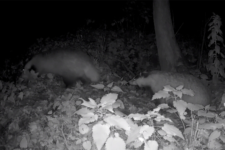 В национальном парке «Калужские засеки» фотоловушки запечатлели семейство барсуков.