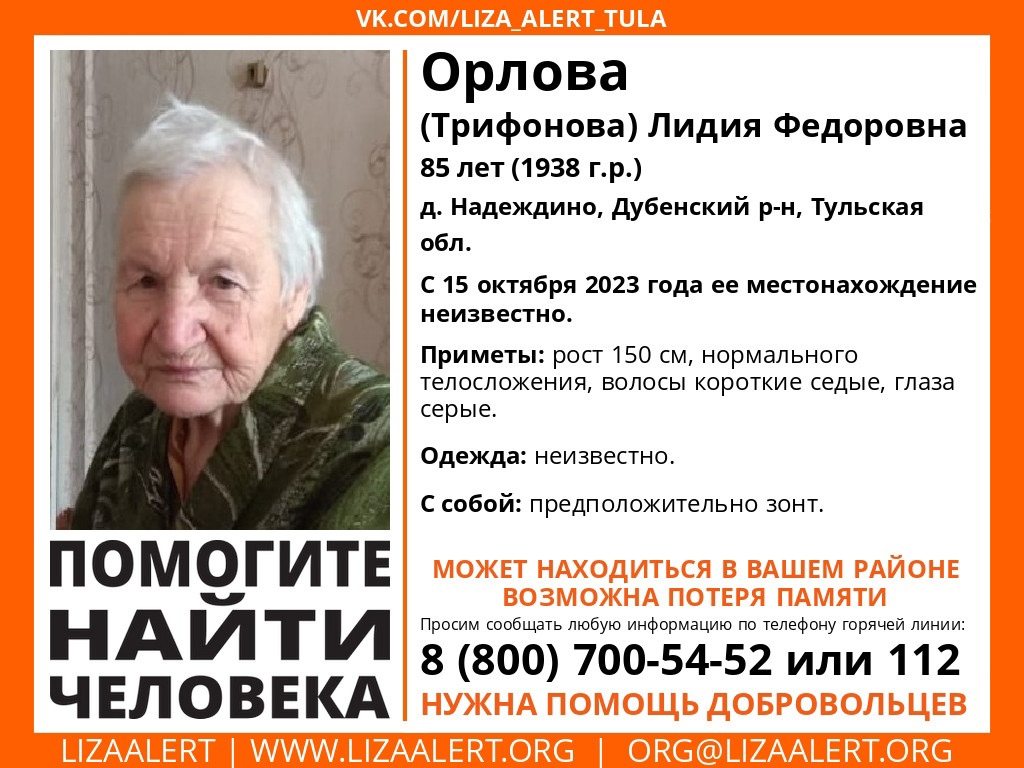 Информация об этом поступила от волонтеров из отряда «ЛизаАлерт» в Тульской области. Во что была одета пенсионерка на момент пропажи — неизвестно. Из примет — рост 150 сантиметров, нормального телосложения, волосы короткие, седые, глаза серые.