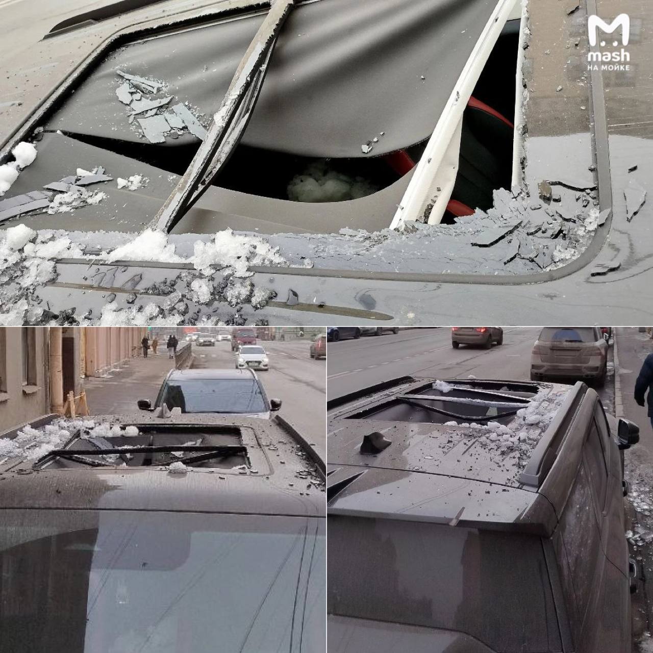 Беспощадная питерская оттепель, традиционно несущая опасность, испортила утро жителю Васьки — упавшая с крыши дома наледь пробила панорамную крышу авто и вместе с осколками залетела в салон.