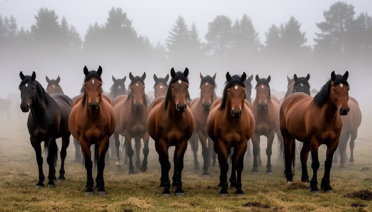 В тумане, где видимость ограничена, тени, игра света и тени, контуры деревьев или холмов могут быть интерпретированы мозгом как силуэты животных, в данном случае лошадей. Мозг «достраивает» изображение, основываясь на имеющихся знаниях и ожиданиях. Туман может создавать оптические иллюзии, искажая размеры и расстояния. Из-за этого обычные объекты могут казаться больше или принимать необычные формы, напоминающие животных. Особая структура тумана, освещение на рассвете и рельеф местности могут в совокупности создавать условия для появления необычных визуальных эффектов, которые люди интерпретируют как силуэты лошадей.