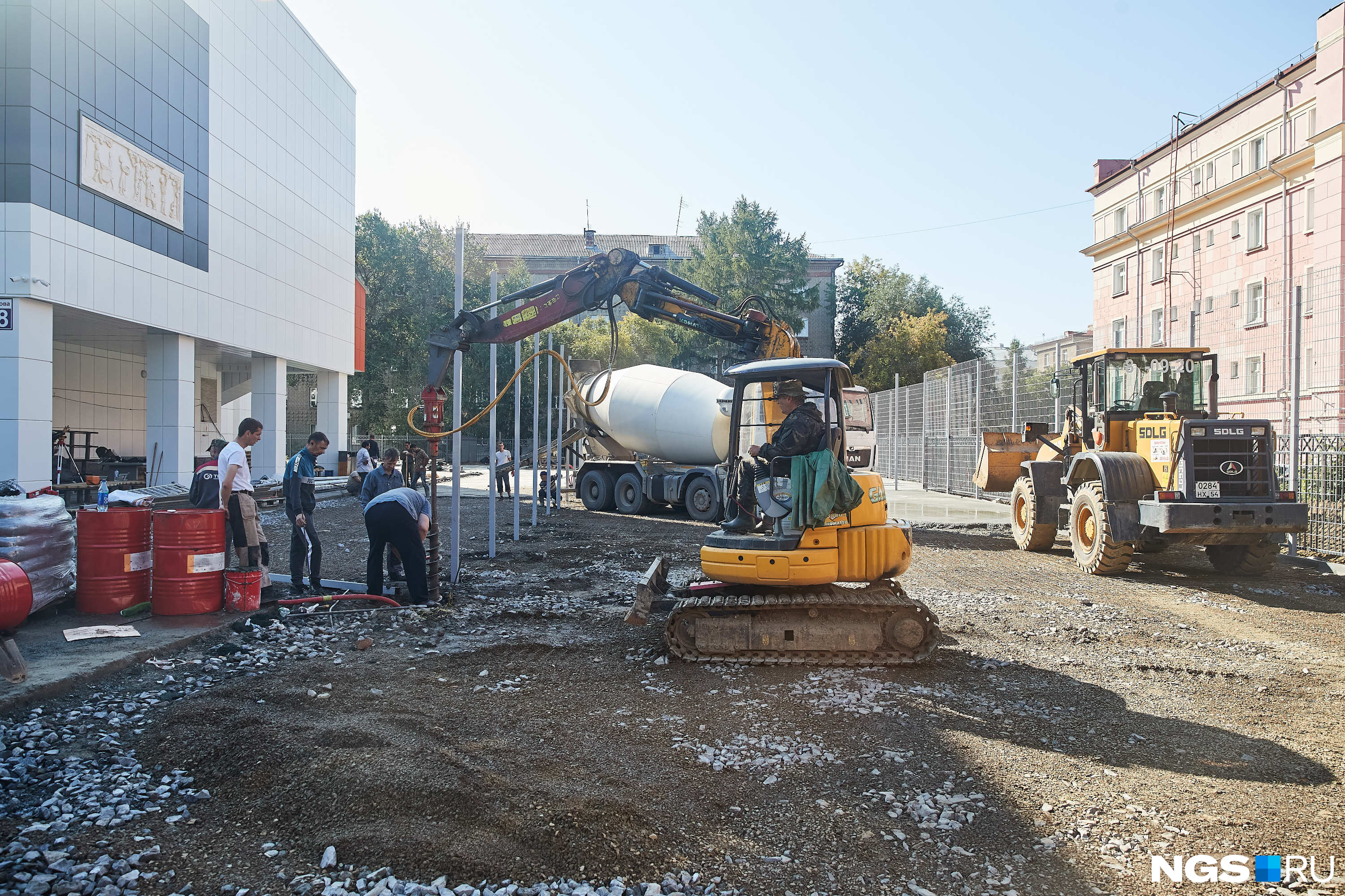 Пока учителя знакомят ребят с новым материалом, на заднем дворе все еще строят площадку.