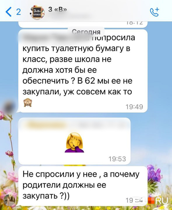 В подтверждение своих слов она прислала скрин из школьного чата. Сообщение о просьбах скинуться на средства личной гигиены возмутило родителей. Они задались вопросом, не должна ли школа покупать всё это за свой счет.