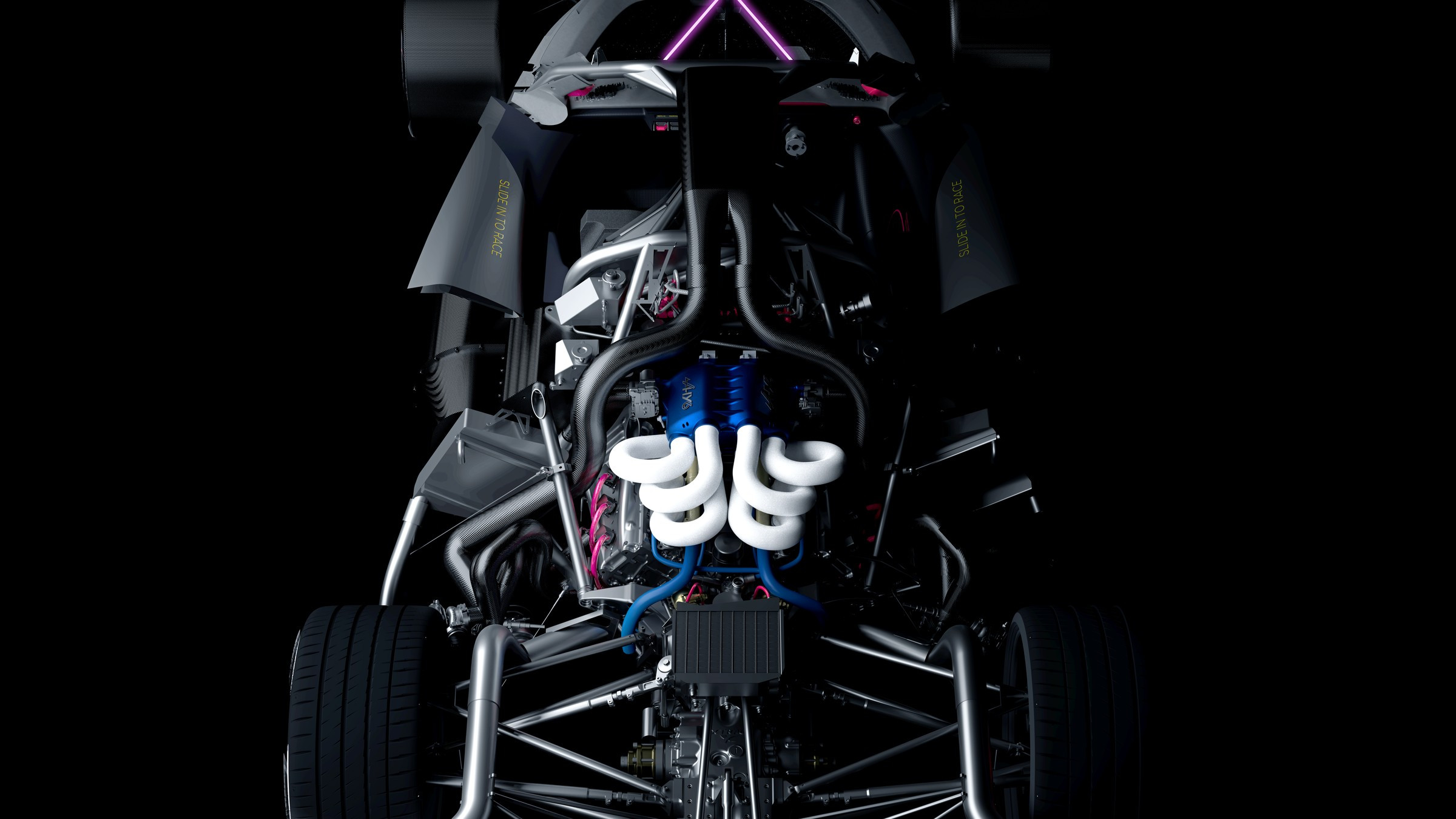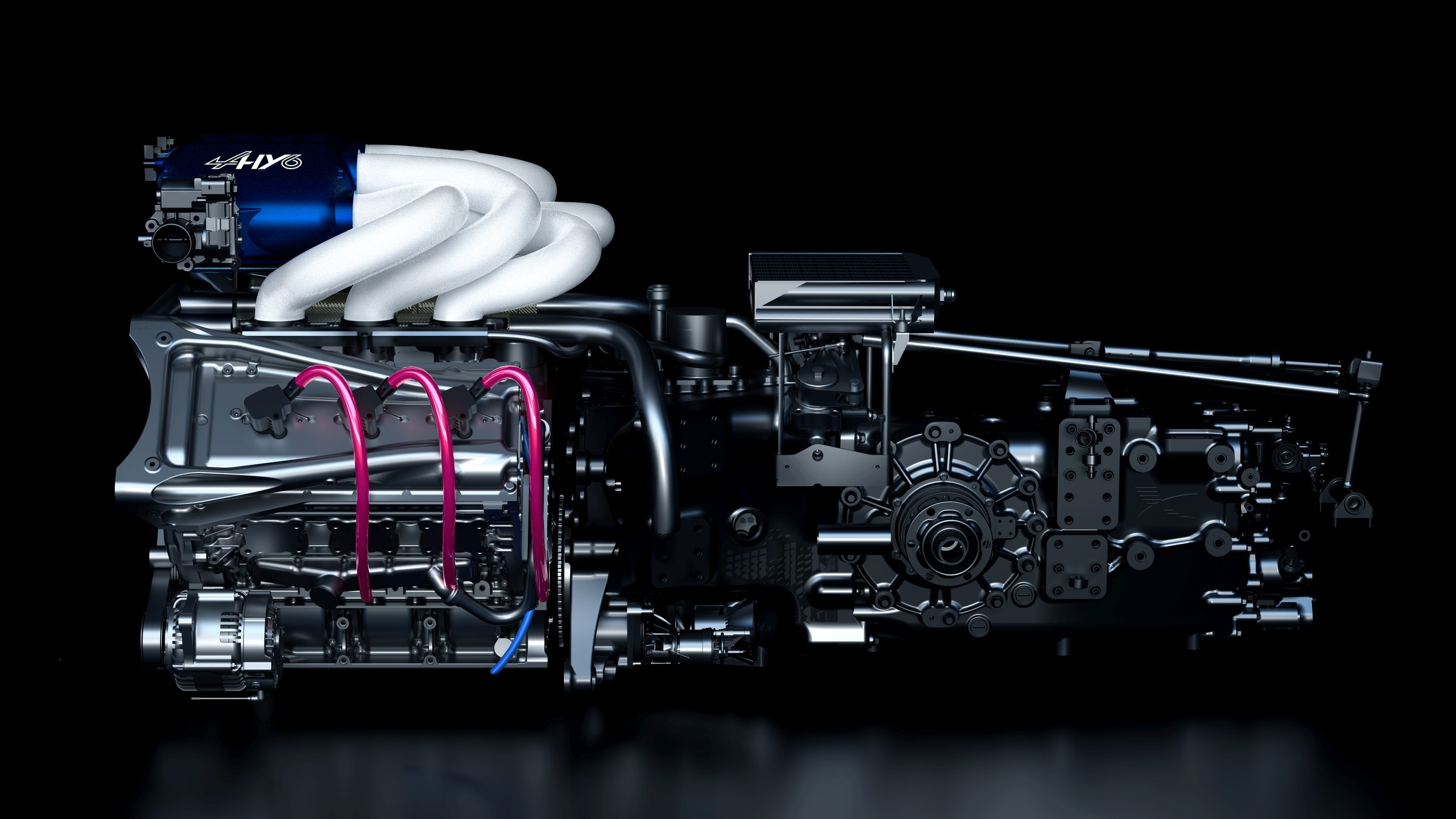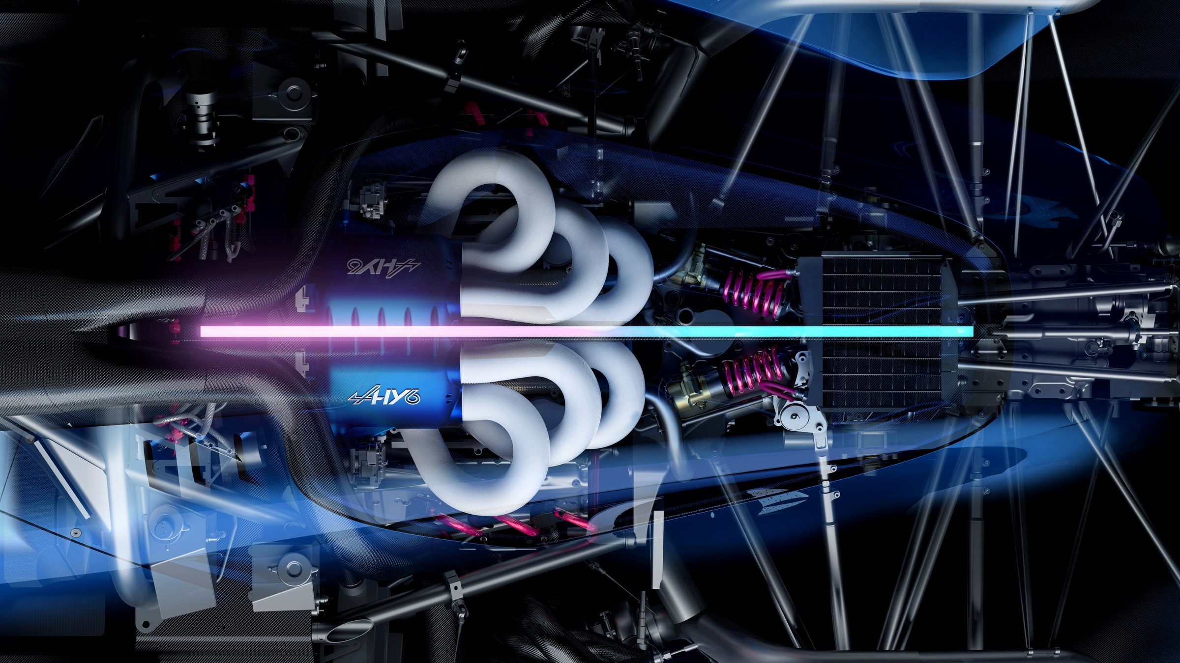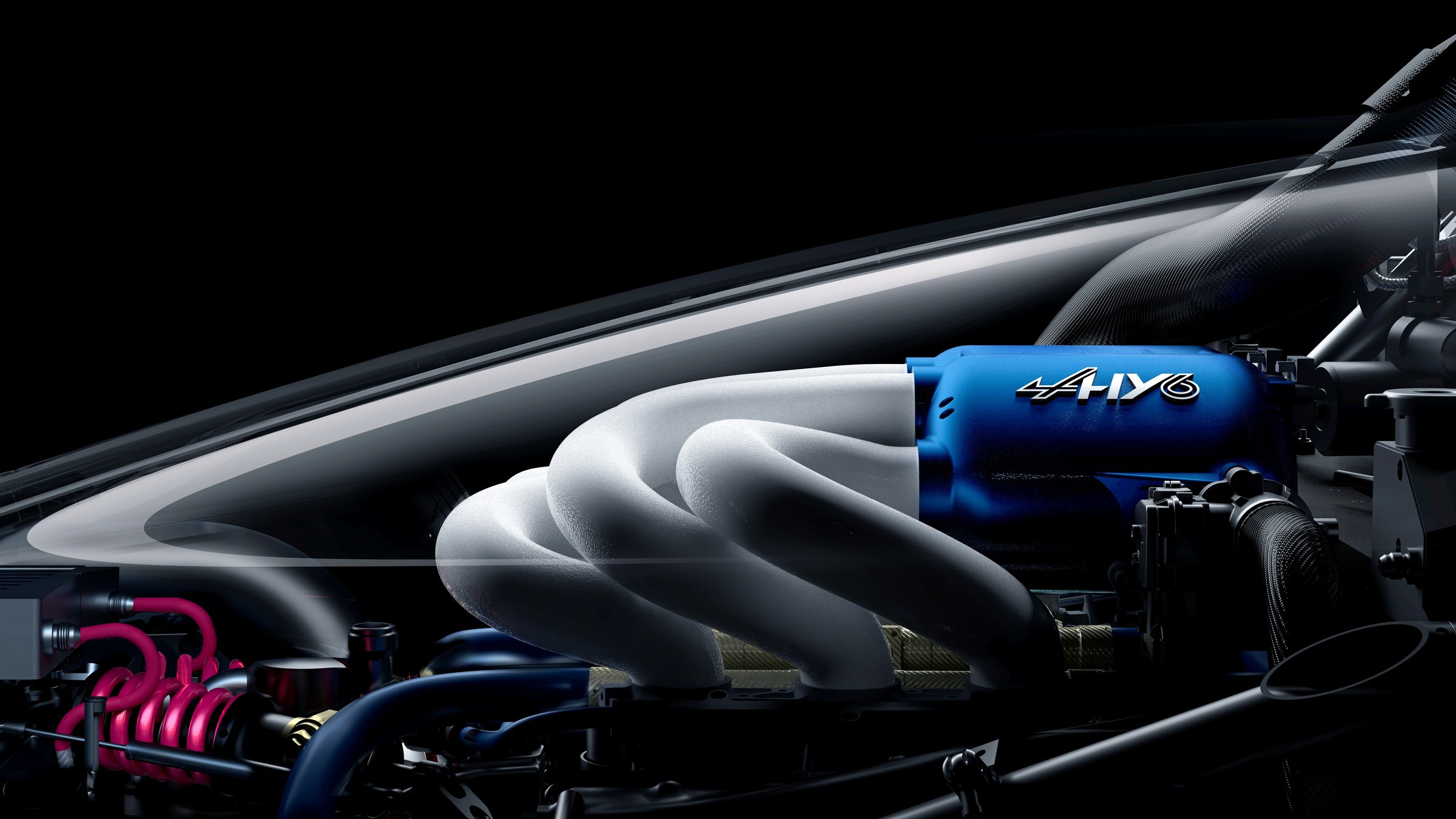 Водородный V6 имеет рабочий объём 3500 см3, два турбокомпрессора, четыре распредвала с цепным приводом, четыре клапана на цилиндр, непосредственный впрыск и инконелевую выпускную систему. Угол развала между головками блока — 100 градусов. Диаметр цилиндра — 95 мм, ход поршня — 82,3 мм. Максимальная отдача — 740 л.с. при 7600 об/мин и 770 Нм при 5000 об/мин. Максимальная частота вращения коленвала — 9000 об/мин. Вся мощность передаётся на задние колёса через гоночную 6-ступенчатую секвентальную коробку передач Xtrac. Водород хранится в трёх углепластиковых баллонах под давлением 700 бар, каждый баллон вмещает 2,1 кг газа. Пресс-служба Alpine утверждает, что водородный V6 имеет потрясающий звук выхлопа. Расчётная максимальная скорость суперкара — 330 км/ч.