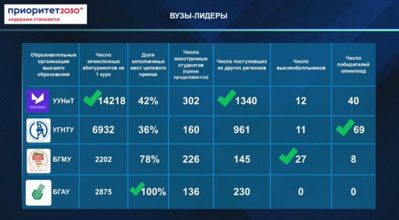 Всего зачислили на 1 курс в УУНиТ 14 218 абитуриентов, в УГНТУ – 6932, БГМУ – 2202, БГАУ– 2875. Также в текущем году было небольшое снижение числа абитуриентов из других регионов по сравнению с прошлым годом: 3039 человек к 3096.