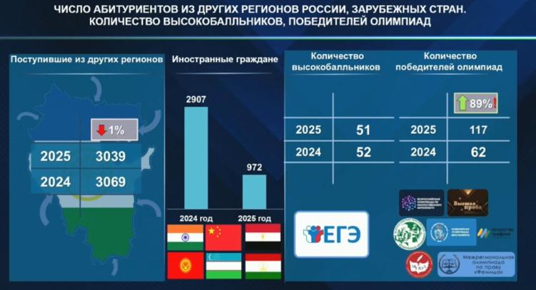 Количество высокобалльников почти не изменилось – 51 человек за 2025 года к 52 за 2024. Победителей олимпиадников выросло на 89% – 117 к 62. В текущем году в УУНиТ поступили 12 высокобалльников и 40 олимпиадников, в УГНТУ – 11 и 69 соответственно, БГМУ – 27 и 8 соответственно, БГАУ – ни одного из перечисленного.