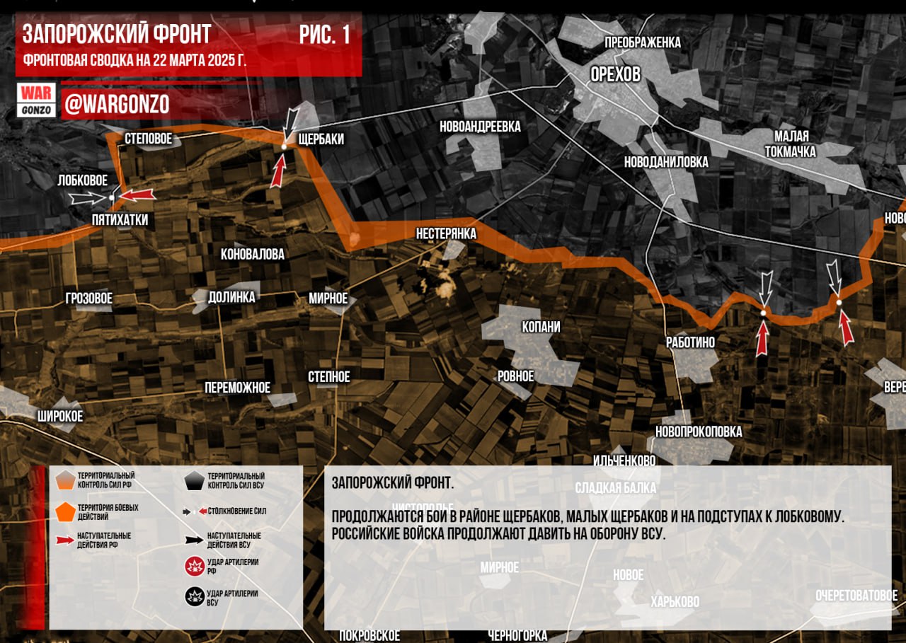 Запорожский фронт. Продолжаются бои в районе Щербаков, Малых Щербаков и на подступах к Лобковому. Российские войска продолжают давить на оборону ВСУ. (Рис.1)