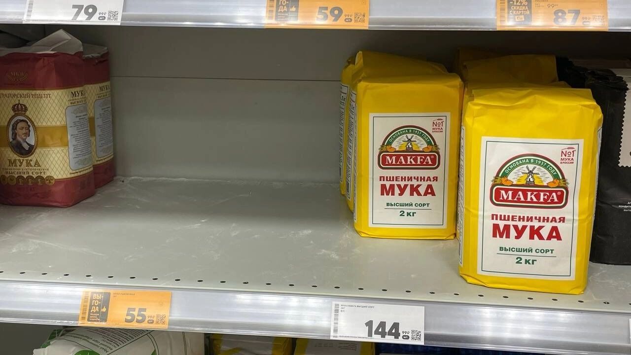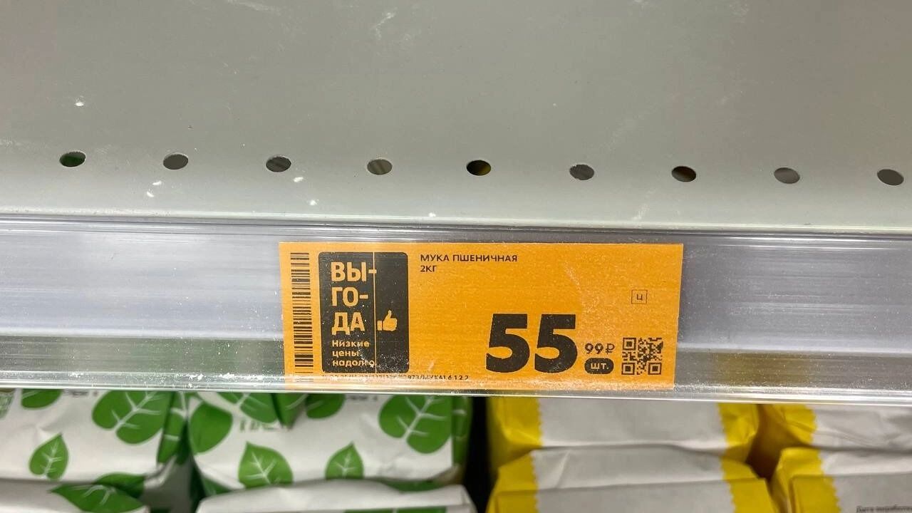 Следом за чаем мы отправились на поиски пшеничной муки высшего сорта за 27 руб./кг. Ценник был найден — 55 рублей за 2 кг. Однако и здесь за победой нас ждало поражение — в наличии муки не оказалось, но в этот раз было хотя бы видно, что раньше она здесь была.