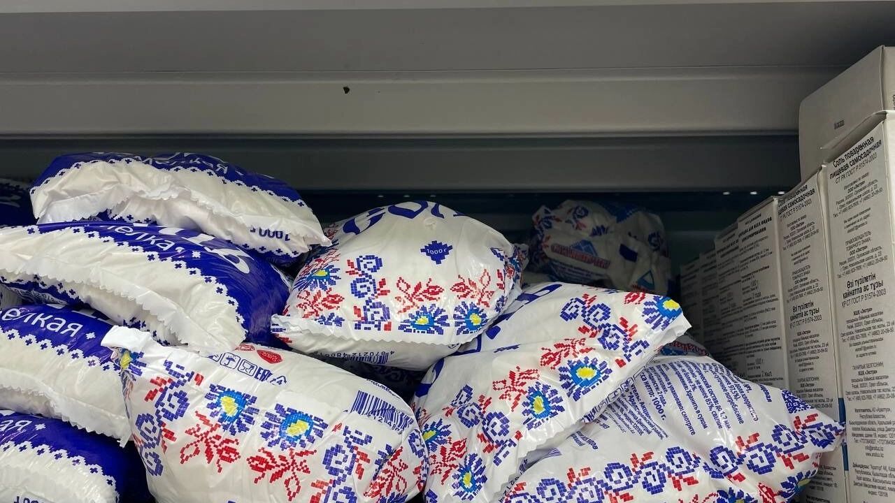 Четвёртой по списку в этом магазине была поваренная пищевая соль за 11 рублей. По такой цене мы её и нашли. Здесь совпало всё — и наличие, и стоимость. Однако качество соли нас немного смутило. Взяв пачку в руки, наощупь стало ясно, что соль в пакете слиплась и стала почти кусковой.