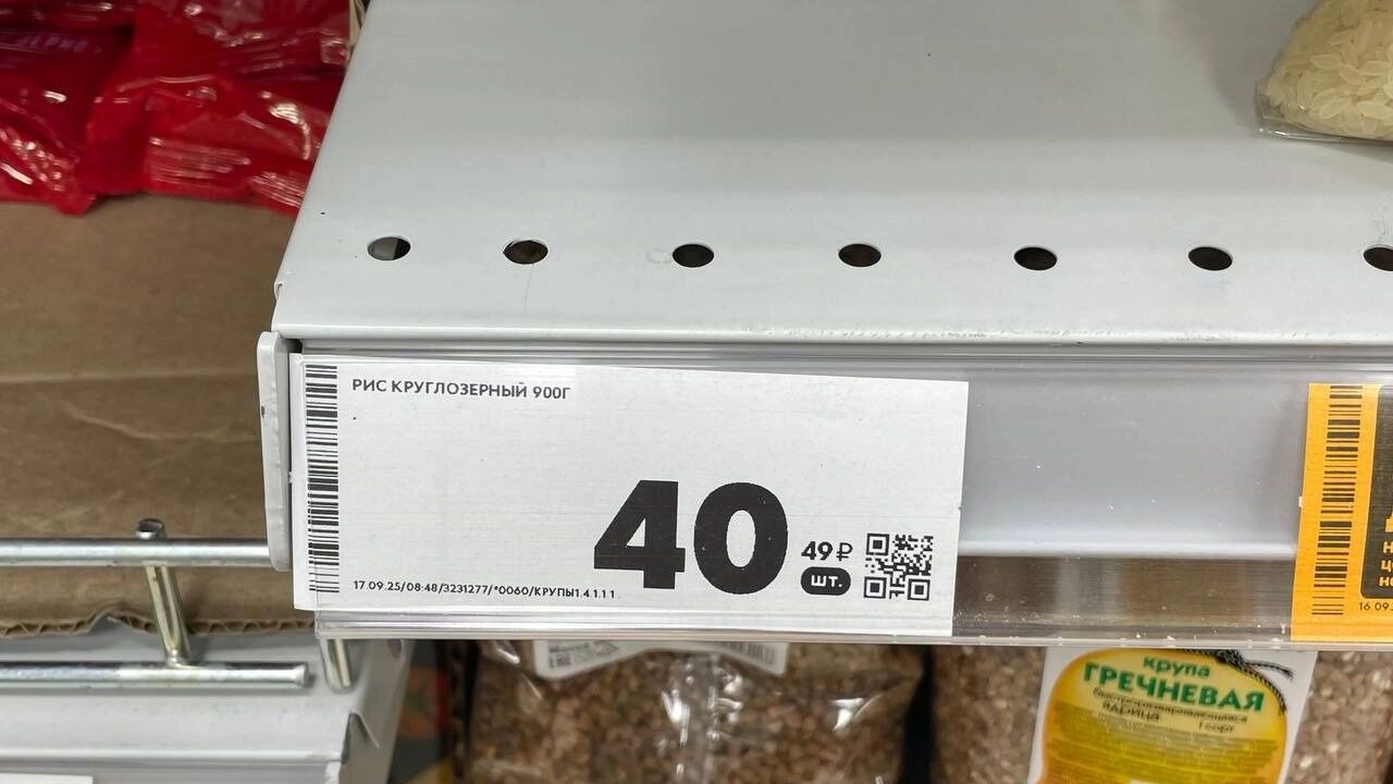 Девятая позиция — круглозёрный рис. Его цена должна была составлять 46 рублей. Здесь случилось всё, да наоборот. Риса за 46 рублей мы не нашли, зато обнаружили ценник ещё ниже — 40 рублей.