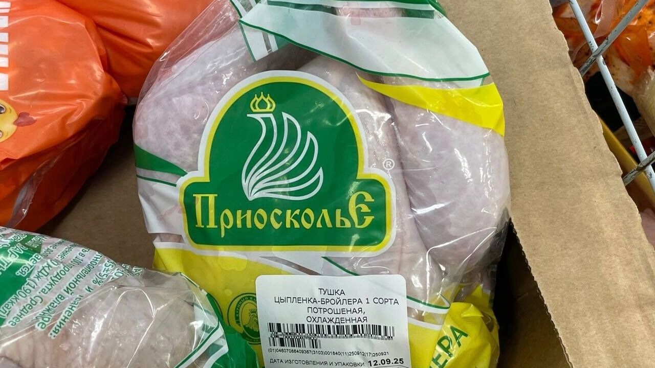 Первой по списку была курица (тушка ЦБ). Она, если верить подборке мэра, должна стоить 189 рублей. Однако такой цены мы не обнаружили. Самой дешёвой тушкой, которую мы отыскали, стала курица от фирмы «Приосколье» за 197 рублей. Причём с пометкой: «Выгода. Низкие цены надолго». Только по низкой цене курица должна стоить на восемь рублей дешевле.