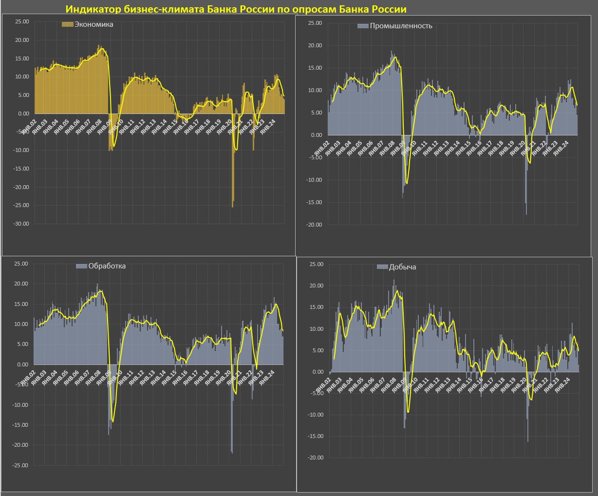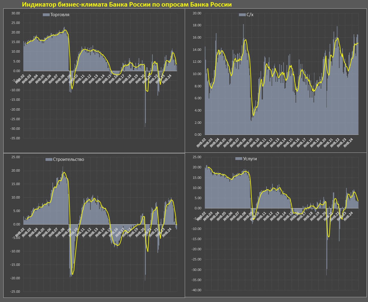 🔘Строительство: практически повторение худших показателей ноя.24, являющиеся худшим индикатором с кризисного сен.22, пик был зафиксирован в фев.24.