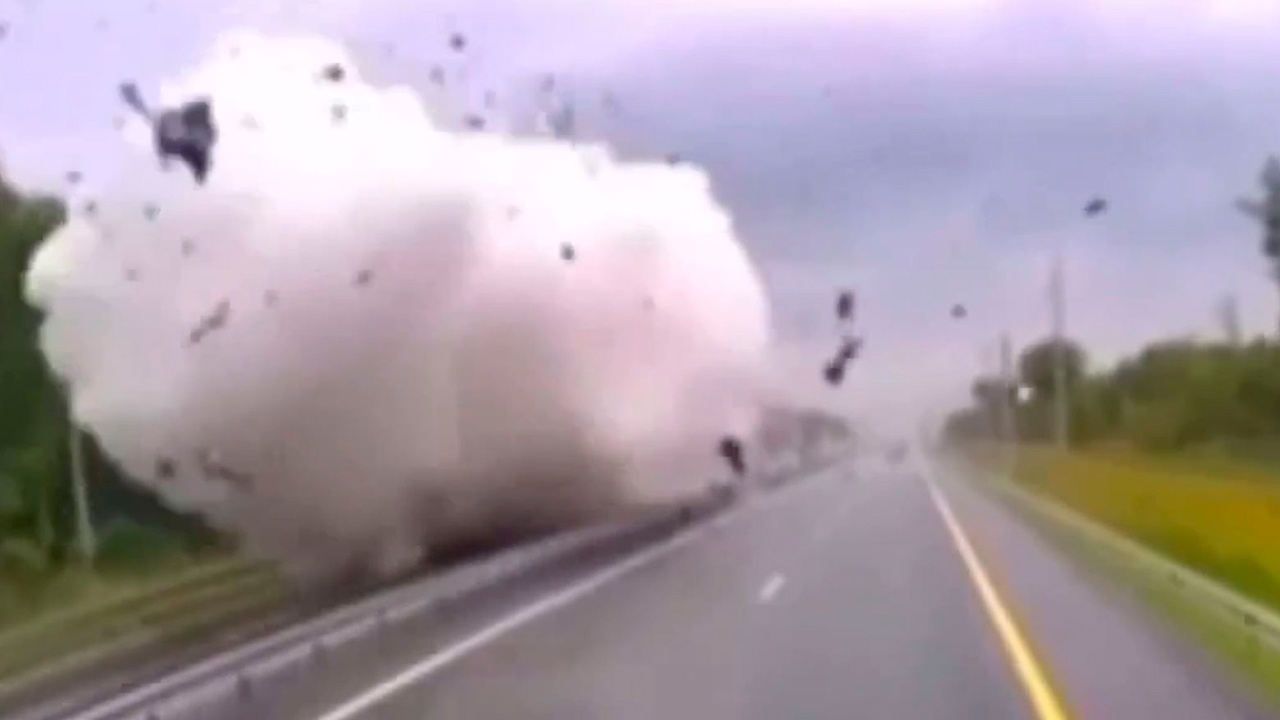На кадрах видно, как автомобиль с цистерной на высокой скорости догоняет грузовик, перевозивший другие машины, а потом врезается в него. Происходит взрыв, обломки летят в разные стороны.
