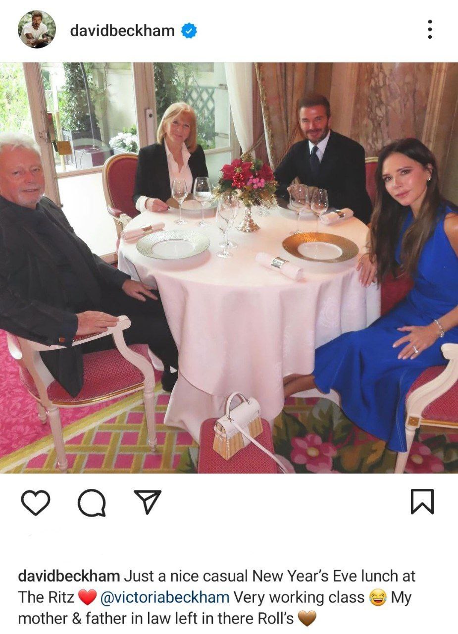 Дэвид Бекхэм решил вновь напомнить про простую семью Виктории. Экс-футболист выложил фото с новогоднего ланча из дорого отеля The Ritz и написал про приятную встречу со свекром и свекровью из рабочего класса.