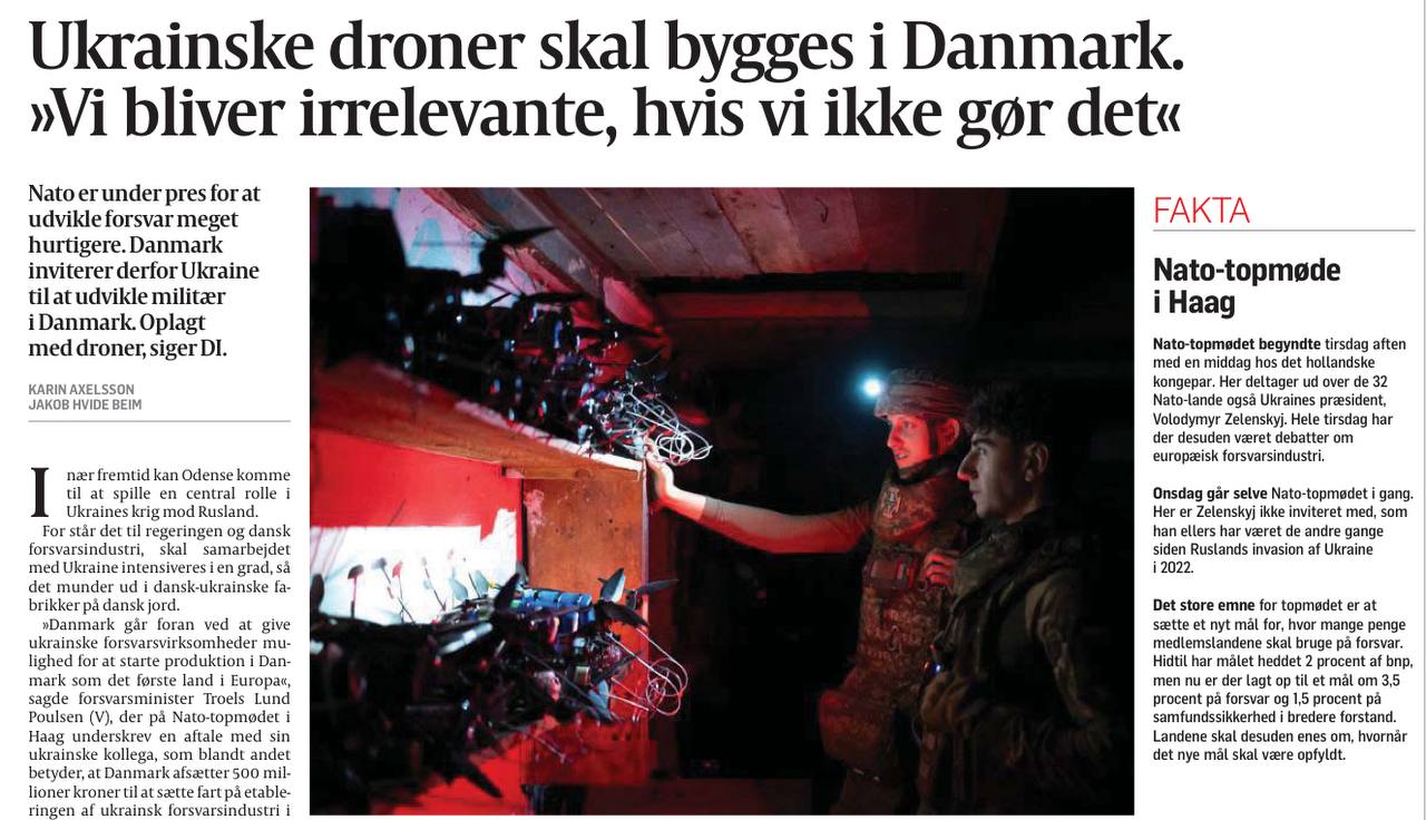 Датская пресса с воодушевлением восприняла сообщение своего правительства о том, что украинские боевые дроны будут собираться на заводе в Оденсе. Газета Politiken, к примеру, пишет об этом с гордостью и радостью: «В ближайшем будущем Оденсе может сыграть центральную роль в войне Украины против России».