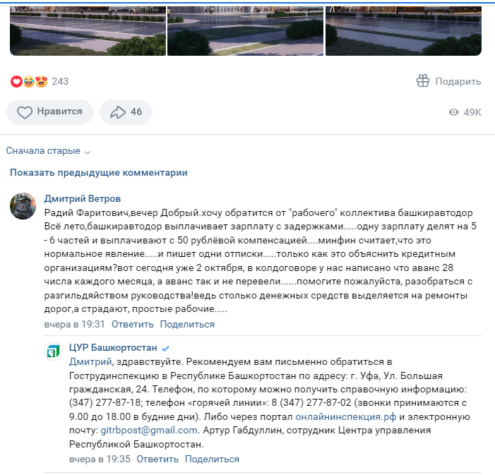 «Хочу обратиться от рабочего коллектива Башкиравтодора. Всё лето организация выплачивает зарплату с задержками. Одну зарплату делят на 5-6 частей и выплачивают с 50-рублёвой компенсацией. Минфин считает, что это нормальное явление, и пишет одни отписки. Только как это объяснить кредитным организациям? Вот сегодня уже 2 октября, в колдоговоре у нас написано, что аванс 28 числа каждого месяца, а аванс так и не перевели. Помогите, пожалуйста, разобраться с разгильдяйством руководства! Ведь столько денежных средств выделяется на ремонты дорог, а страдают простые рабочие», — возмущается Дмитрий Ветров.