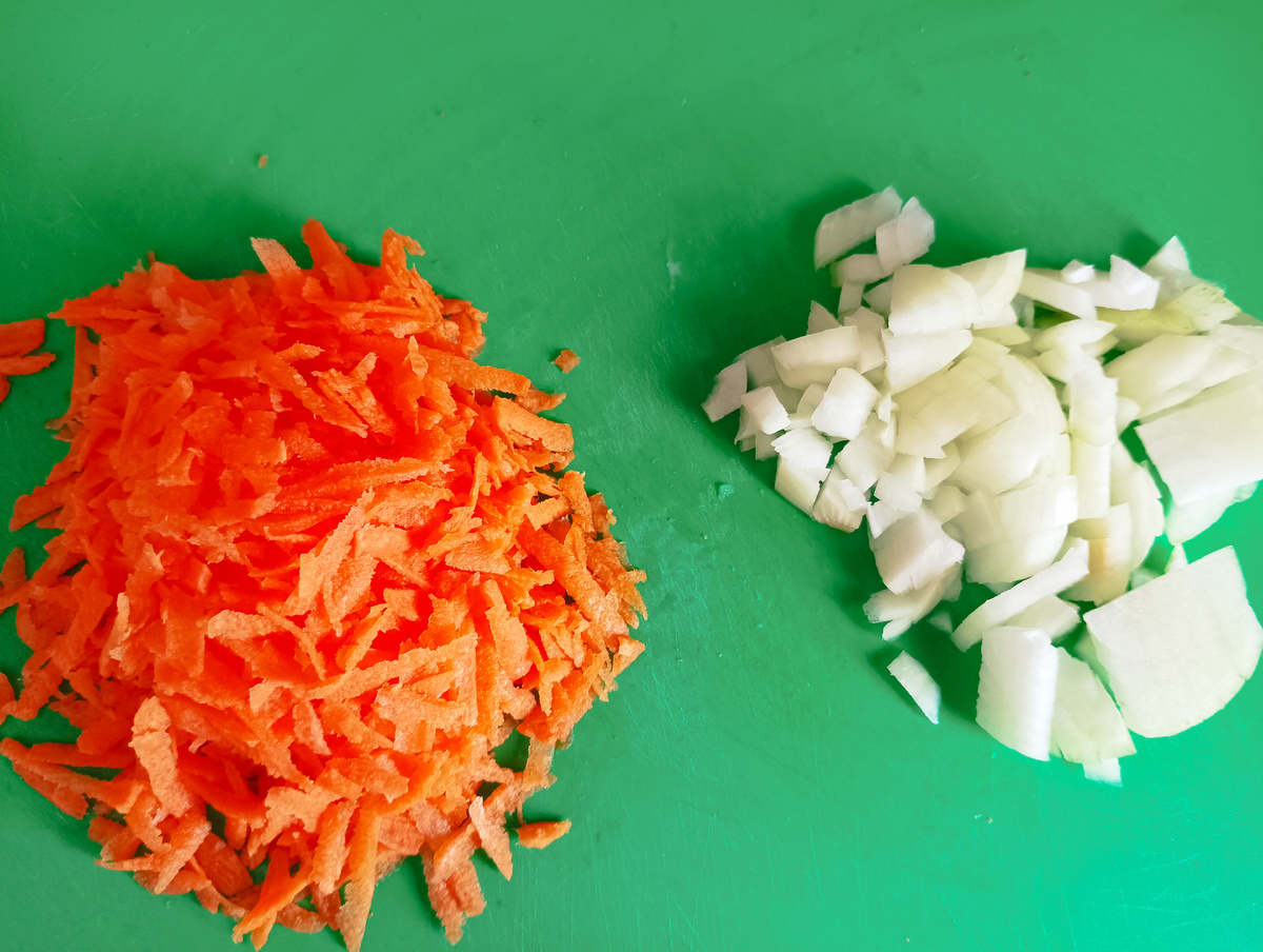 Заранее готовлю мясной бульон. Морковь натираю на тёрке, а лук нарезаю мелко.