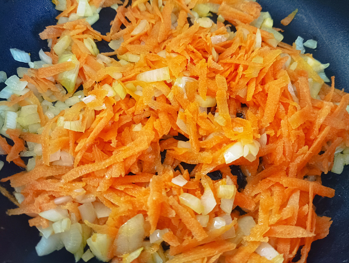 Сначала обжариваю лук до прозрачности, затем добавляю морковь в сковороду.