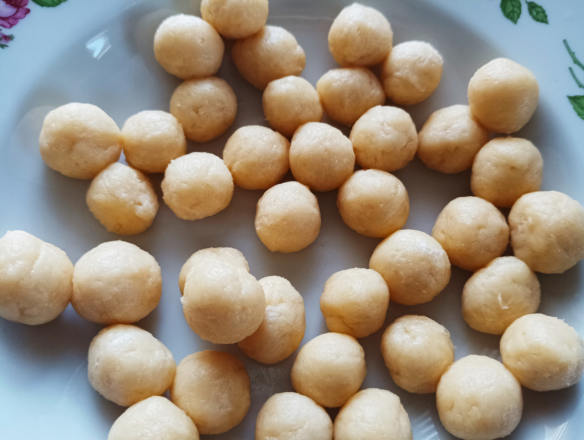 Из сырного теста катаю маленькие шарики. Если их скатать размером с фундук в скорлупе, то при приготовлении они разбухнут до классического размера фрикаделек (увеличатся в размере минимум в 2 раза). Количество фрикаделек приблизится к 80. Имейте это ввиду.